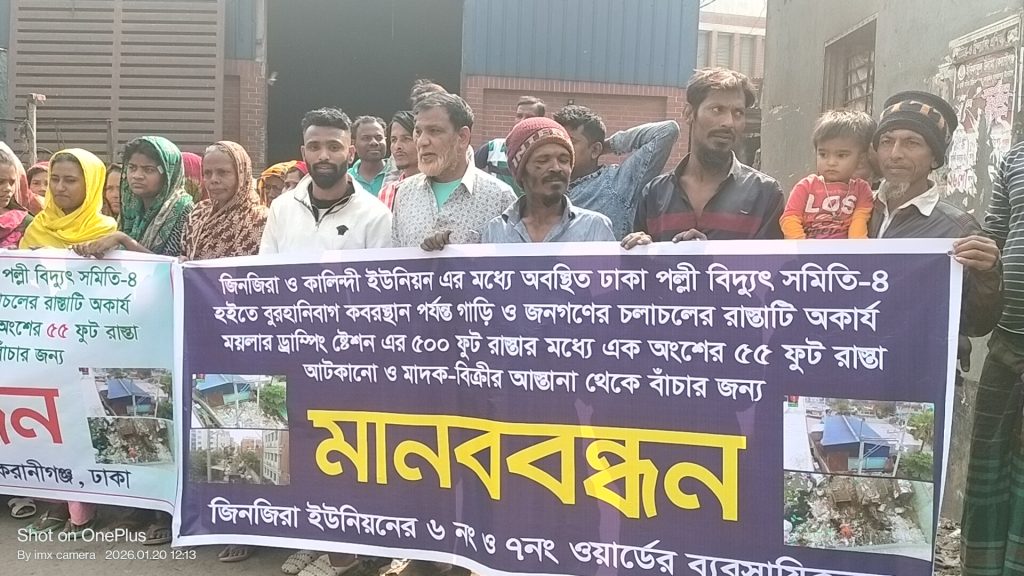 বক্তারা জানান, জিনজিরা ও কালিন্দী ইউনিয়নের মধ্যবর্তী ঢাকা পল্লী বিদ্যুৎ সমিতি-৪ থেকে বুরহানিবাগ কবরস্থান পর্যন্ত প্রায় ৫০০ ফুট সড়কের একটি অংশের ৫৫ ফুট রাস্তা ডাম্পিং স্টেশনের কারণে সম্পূর্ণরূপে বন্ধ হয়ে গেছে। এতে যানবাহন ও সাধারণ মানুষের চলাচল ব্যাহত হচ্ছে। পাশাপাশি এলাকাটি মাদক বিক্রির আখড়ায় পরিণত হওয়ায় সামাজিক নিরাপত্তাও হুমকির মুখে পড়েছে।