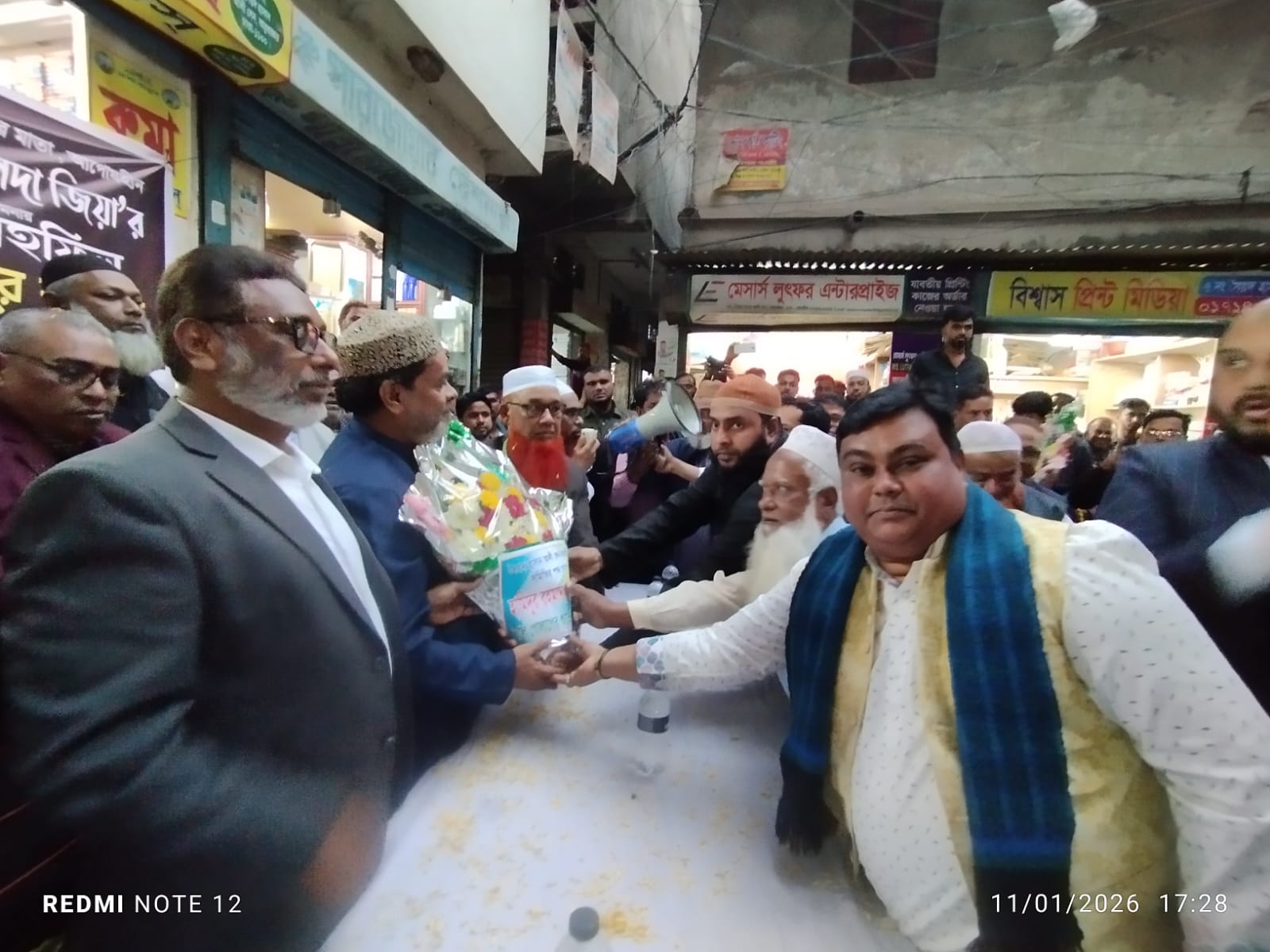 ঢাকা ৭ আসনের বিএনপির মনোনীত প্রার্থী হামিদুর রহমান হামিদের হাতে ফুলের শুভেচ্ছা জানান মোস্তাফিজুর রহমান মোস্তাক।