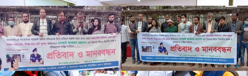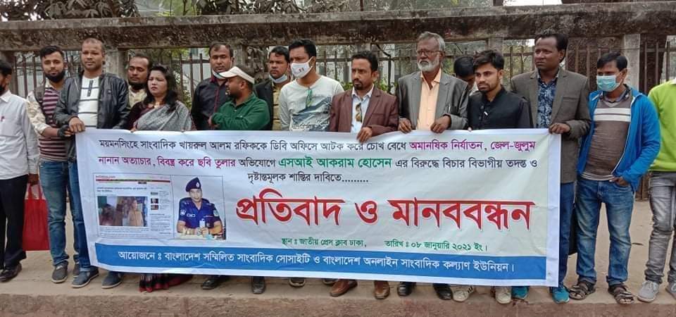 ময়মনসিংহের সিনিয়র সাংবাদিক খায়রুল আলম রফিককে নির্যাতনকারী তৎকালীন জেলা গোয়েন্দা সংস্থা ডিবি পুলিশের এসআই আক্রাম হোসেনের শাস্তির দাবিতে জাতীয় প্রেসক্লাবের সামনে মানববন্ধন ও প্রতিবাদ সভা হয়েছে । আজ ৮ জানুয়ারি শুক্রবার বাংলাদেশ সন্মিলিত সাংবাদিক সোসাইটি ও বাংলাদেশ অনলাইন সাংবাদিক কল্যাণ ইউনিয়নের উদ্যোগে কয়েকদিন ব্যাপী প্রতিবাদ সভা ও মানববন্ধনের প্রাথমিক কর্মসূচী পালন করা হয় । এতে সাংবাদিকরা ছাড়াও বিভিন্ন শ্রেণি পেশার মানুষ অংশ নেন ।